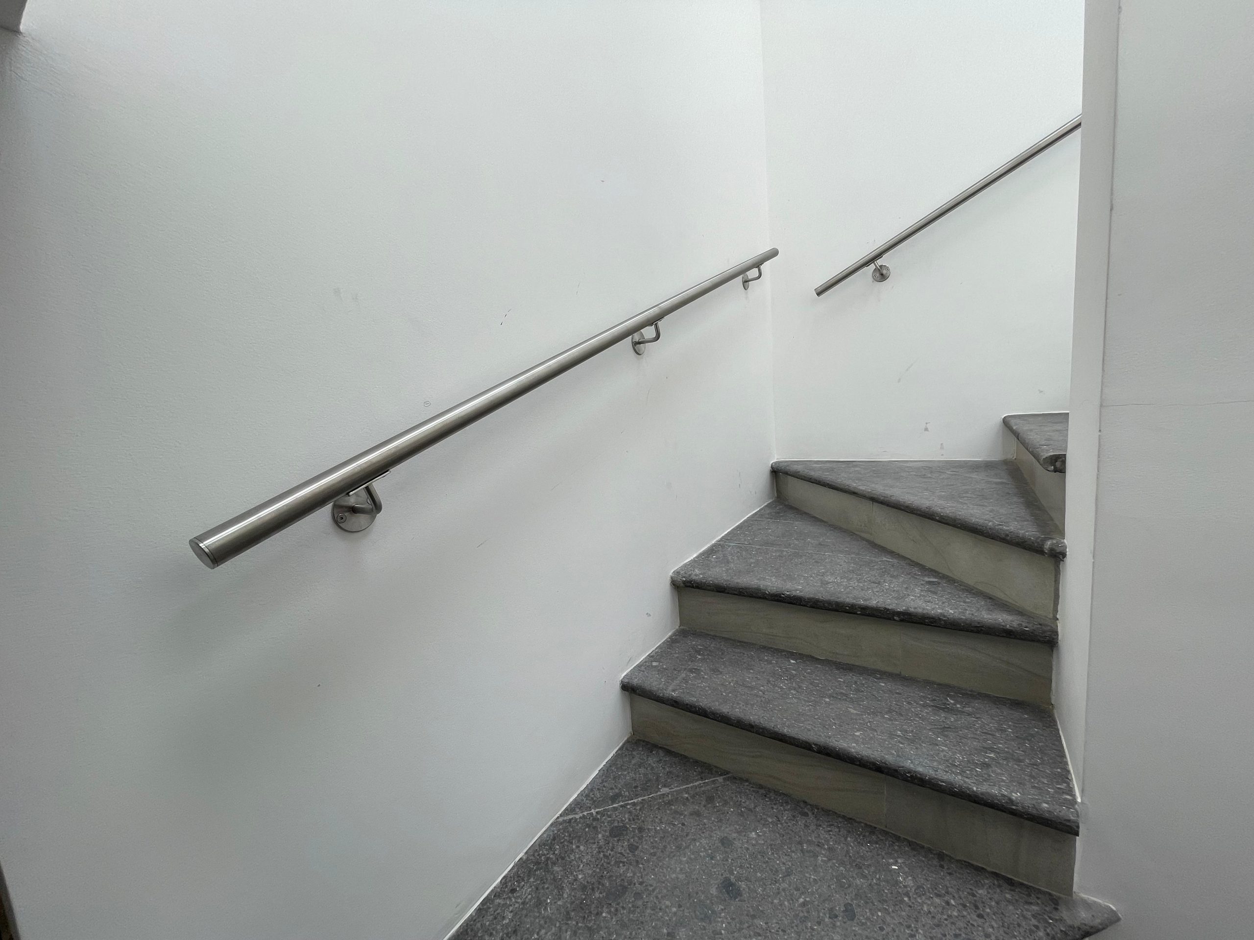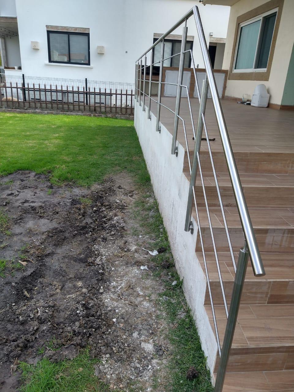 Pasamanos de acero inoxidable de 1 1/2”. con cristal templado de 10 mm, soporte de cristal a pasamanos, chapetones de muro a cristal y tapa terminación de pasamanos.